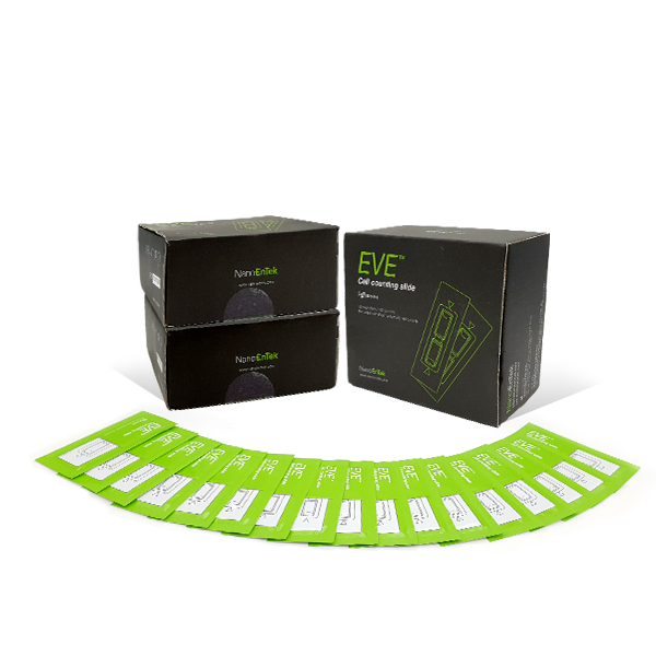 EVE™ Cell counting slides that contain two enclosed chambers to hold the sample to allow you to measure two different samples or perform replicates of the same sample